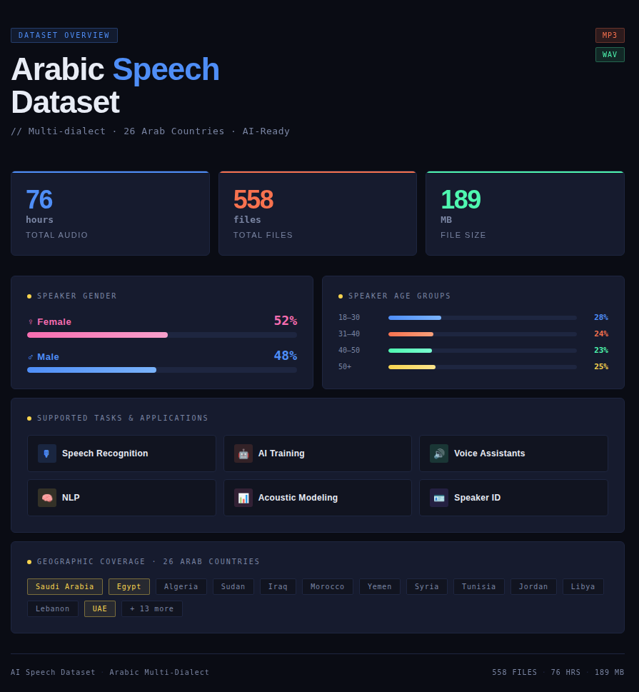A: The dataset includes 76 hours of Modern Standard Arabic from speakers across 26 Arab countries. Contains 558 files in MP3/WAV format totaling 189 MB with comprehensive annotations.