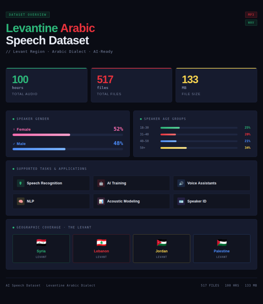 The Levantine Arabic Speech Dataset is a meticulously curated collection of high-quality audio recordings from native Levantine Arabic speakers across Syria, Lebanon, Jordan, and Palestine. This comprehensive linguistic resource features 100 hours of authentic Levantine Arabic speech data professionally annotated and structured for advanced machine learning applications.