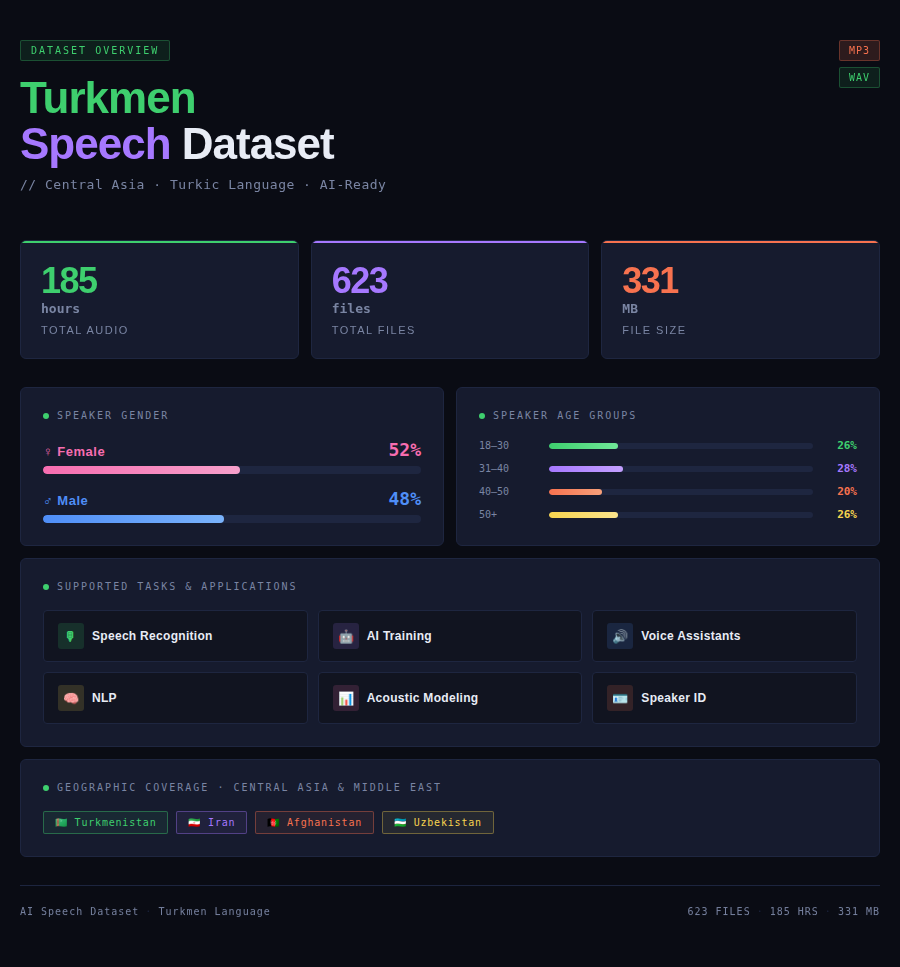 A: The dataset includes 185 hours of audio from Turkmen speakers across Turkmenistan, Iran, Afghanistan, and Uzbekistan. Contains 623 files in MP3/WAV format totaling approximately 331 MB with transcriptions and linguistic annotations.