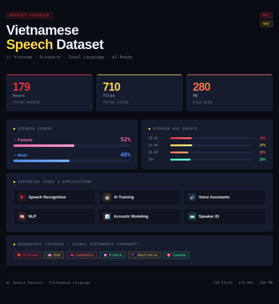 A: The dataset includes 179 hours of audio from Vietnamese speakers across Vietnam and diaspora. Contains 710 files in MP3/WAV format totaling 280 MB with tonal annotations.